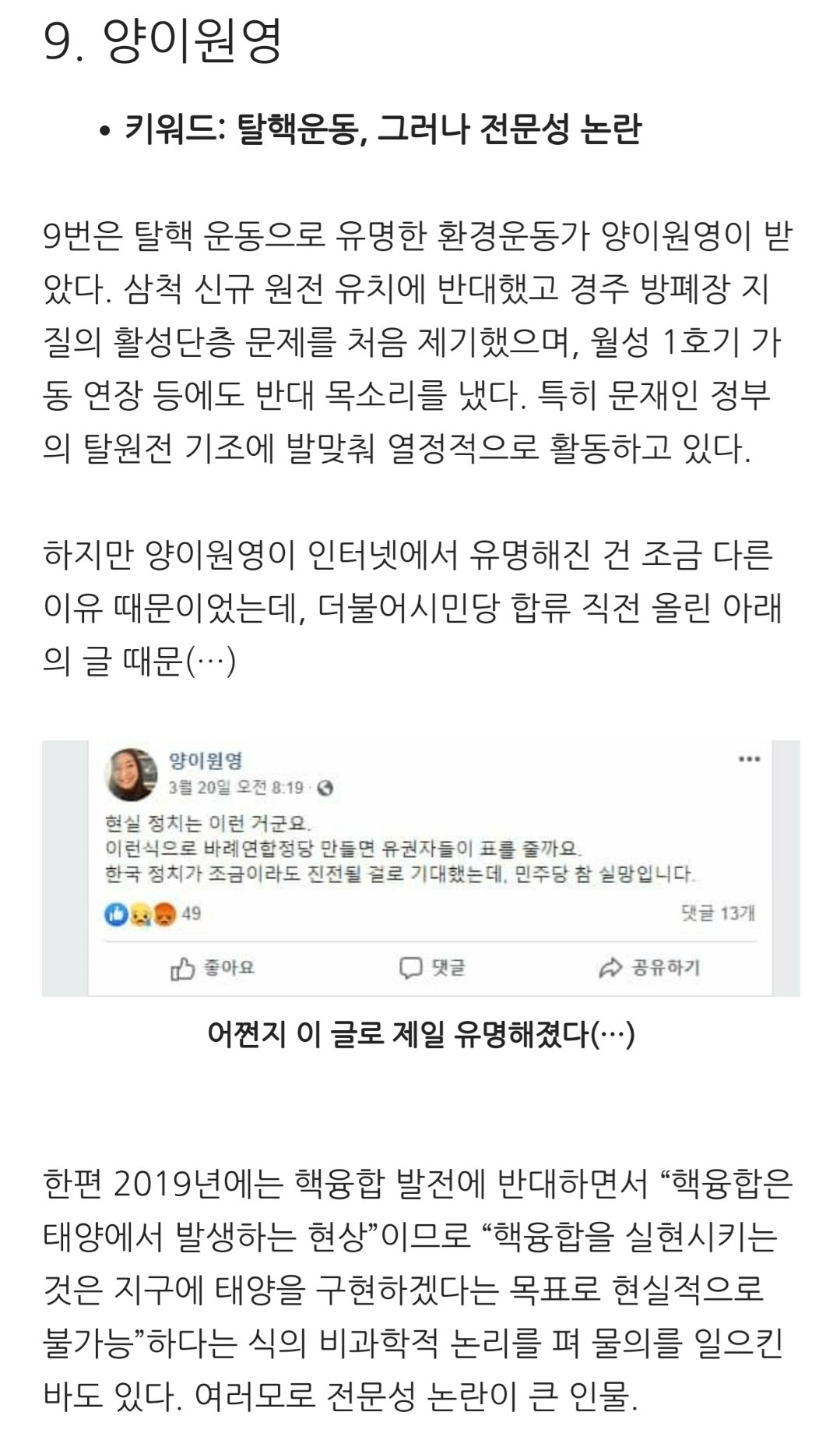 기ë¬í ë¼ì´ë¸ì§¤ ì'ì´ìì ë¹ì ì¸ ì¸í°ë·°ë¥¼ ë³´ë¤ê° ê¶ê¸í´ì¡ìµëë¤ íëë¼tv from imguser2.pandora.tv 2020년 5월 21일, 법원의 개명허가판결 받고 '양원영'에서 '양이원영'으로 개명하였다. 코로나19 관련 중앙재난안전대책본부 공식 브리핑도 나오지 않는 상황에서 양이원영은 일일 신규 확진자 수를 언급해 논란되었다. 중수소는 바닷물 중의 물 분자로부터 얻을 수 있으므로 무진장하다. 핵융합로의 연료는 중수소와 삼중수소 (트리튬)이다. 핵융합 에너지를 얻으려면 태양의 중심보다 뜨거운 1억도 이상의 초고온 플라즈마를. 20년 넘게 환경운동을 해온 양이원영 에너지전환포럼 사무처장 (49·사진)은 녹색당 지지자다. 중대본은 매일 오전 10시 확진자 수 등 코로나19 관련 브리핑을 하는데. 환경운동가 출신으로 20대 총선을 앞두고 더불어민주당에 영입돼서 비례대표로 금뱃지를 단 양이원영 의원은 핵융합 예산 전액 삭감을 맹렬하게 주장하고 있다.